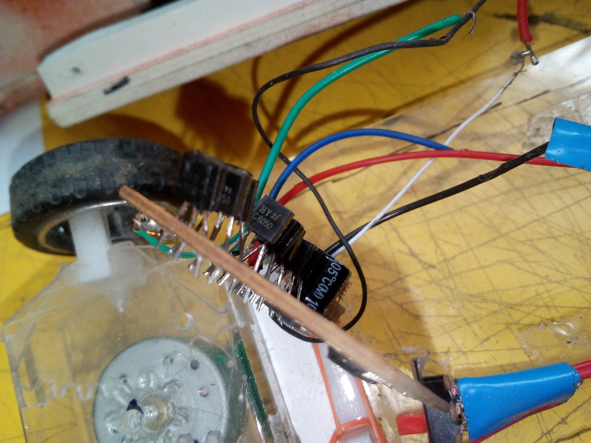 Возникла проблема - он плавно разгонялся даже без нагрузки, а уж машинка в сборе практически не ехала. Ни о каком резком старте, уж тем более дрифте речи не шло. Радиолюбитель из меня никакой, но я подумал, что дело в маленькой силе тока, которая к нему идет. Я блокировал вал, подавал сигнал с пульта, подцепленный мультиметр показывал 1,3А. Я подумал, что дело в транзисторах, используемых в схеме (вот они, 8 шт в ряд):