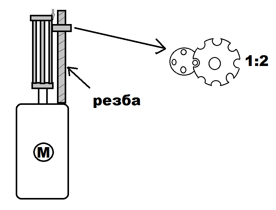 Двигатель приводит в движение вал с трапецеидальной резьбой, по которому бегает гайка-муфта вверх-вниз, толкающая небольшой рычаг.