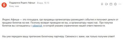 Прошло 180 дней с момента отмены концерта, денег нет, все опять перебрасывают мое обращение друг к другу как мячик. На прямой запрос возврата денег в Сбербанк поступает ответ - у вас было 540 дней с момента оплаты на то, чтобы вернуть деньги; время вышло, мы не при делах. Собираюсь писать досудебную претензию на организаторов и Я.Афишу, но как это правильно делать, не знаю.