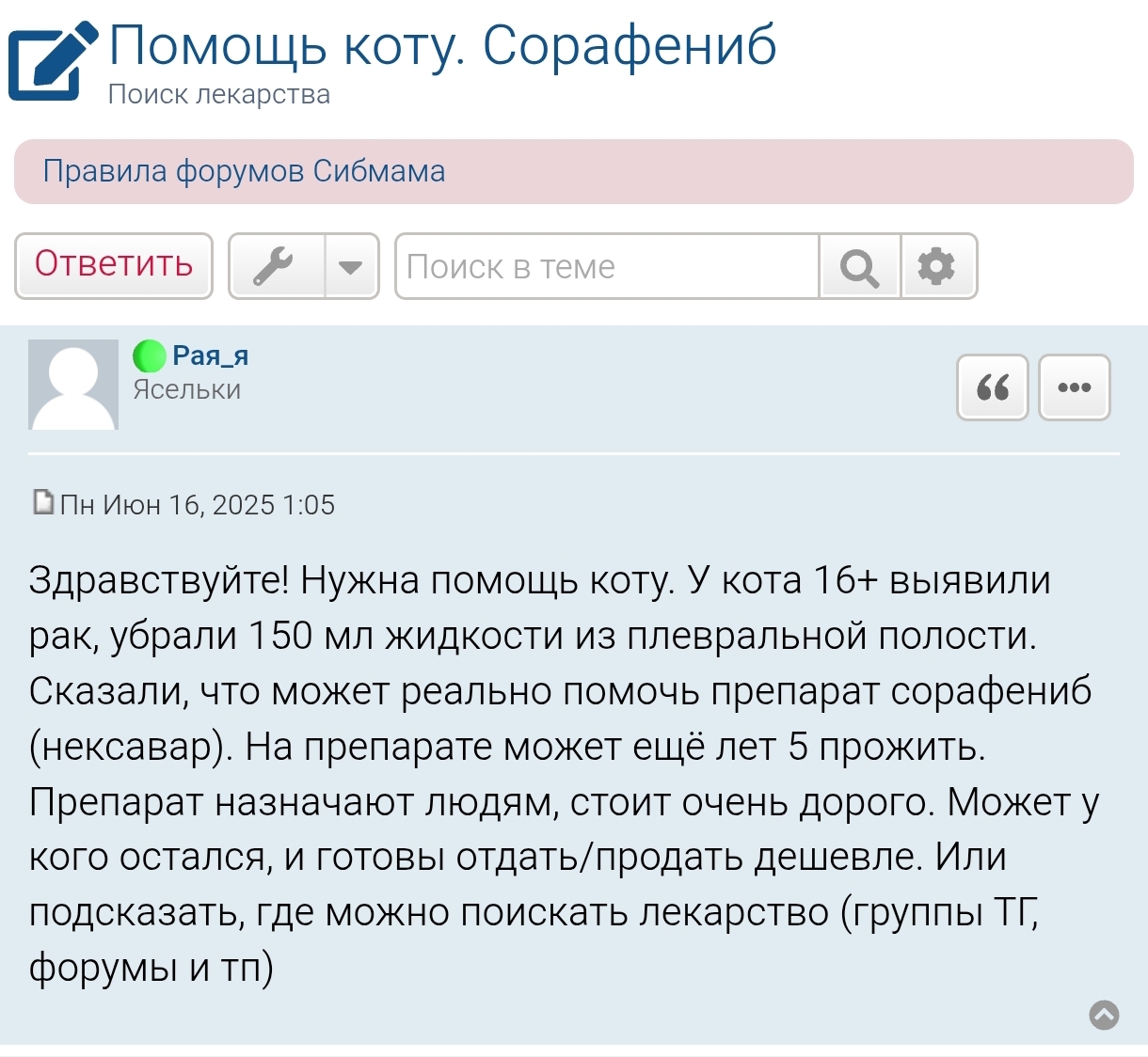 Нужна помощь коту. У кота 16+ выявили рак, убрали 150 мл жидкости из плевральной полости. Сказали, что может реально помочь препарат сорафениб (нексавар). На препарате может ещё лет 5 прожить. Препарат назначают людям, стоит очень дорого. Может у кого остался, и готовы отдать/ продать дешевле. Будем признательны. Кот уже давно член семьи, жалко чертягу...