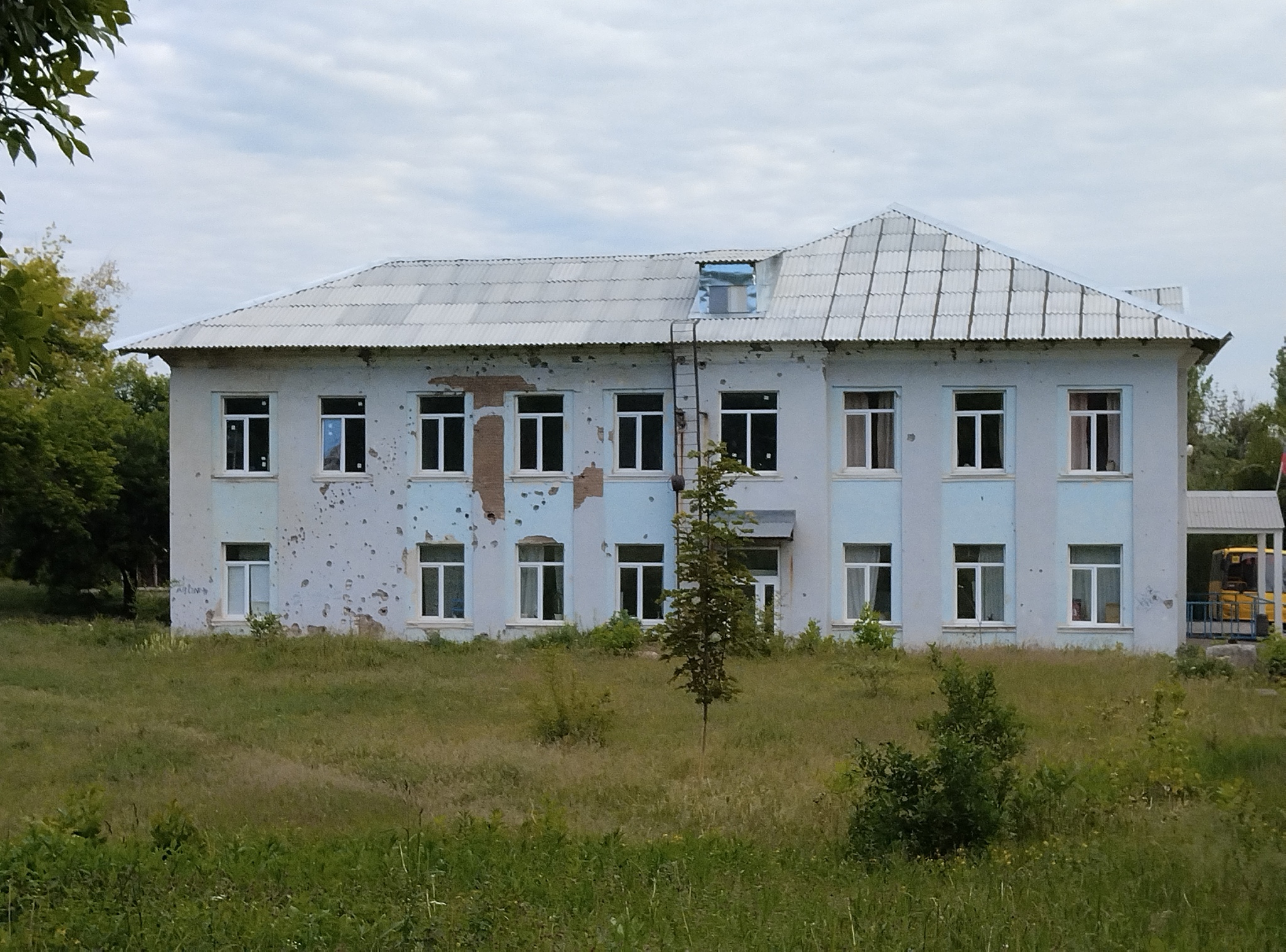 Школа, просто жилые дома, ни каких военных объектов рядом нет и стреляли просто по людям. Видите белую половину дома? А не так давно её не было, эта часть была разбита и горела, но уже восстановили. И таких восстановленных каждый второй дом. Если не знать, то и не заметишь.