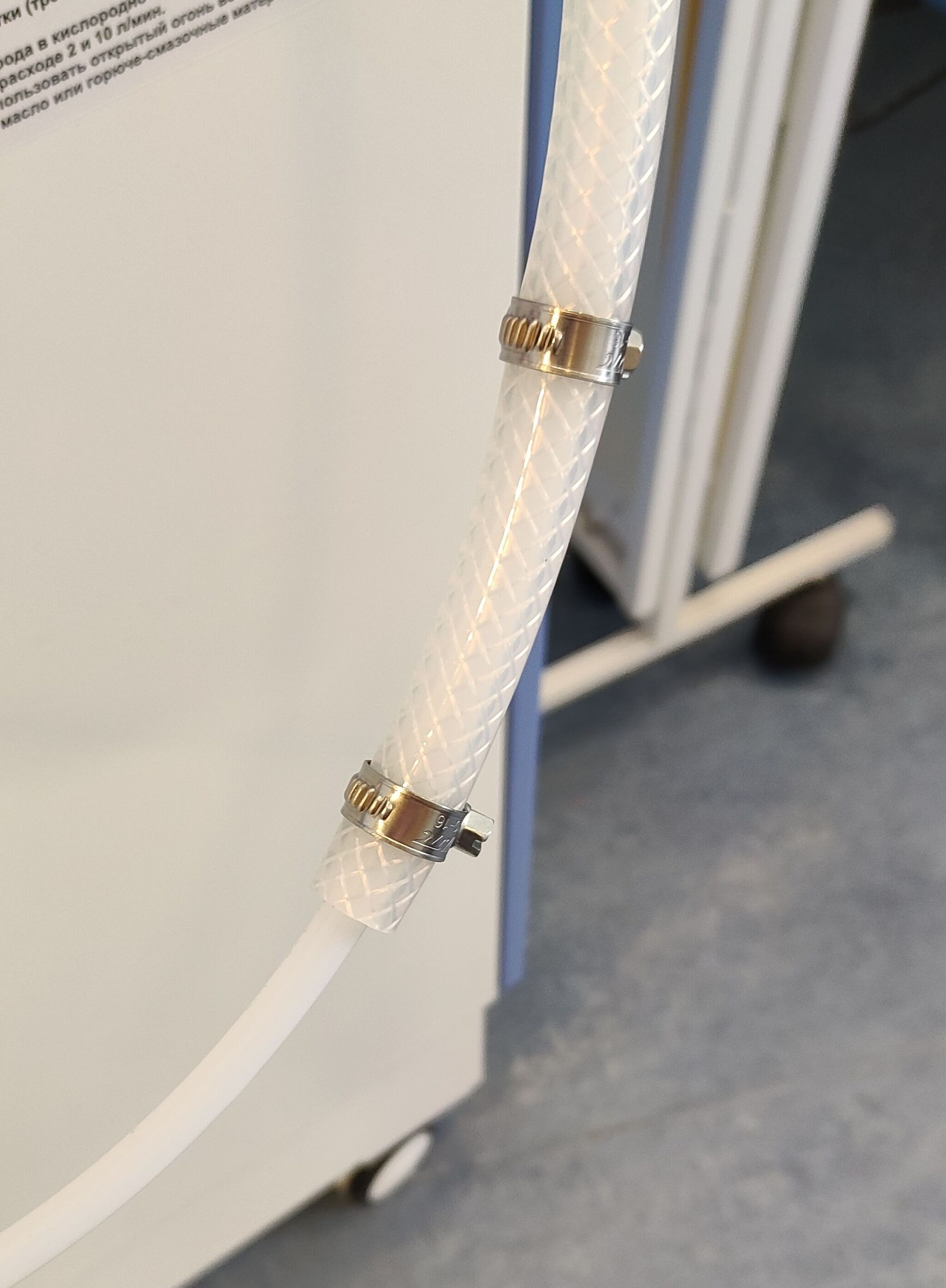 Но к самому наркозно-дыхаательному аппарату которому подключается концентратор подключается гибким армированный шлангом примерные диаметры 9-10мм (внутренний) и 16 мм (наружный).