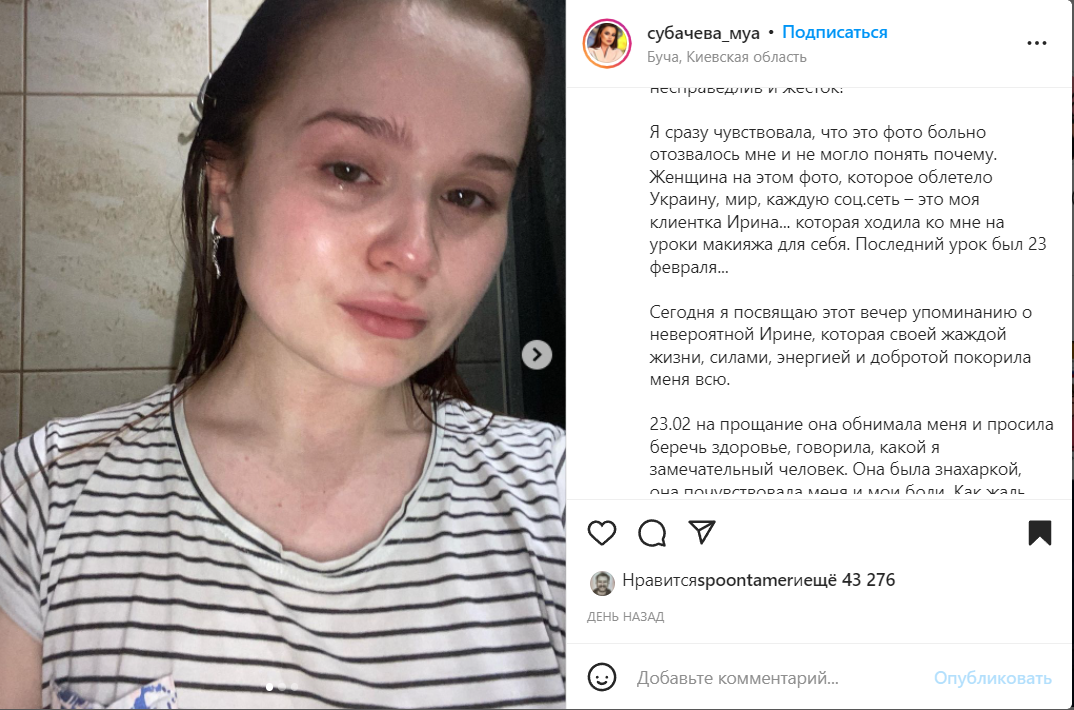 рассказывает, что в одной из фотографий трупов в Буче узнала свою клиентку Ирину, которая ходила на уроки макияжа.
