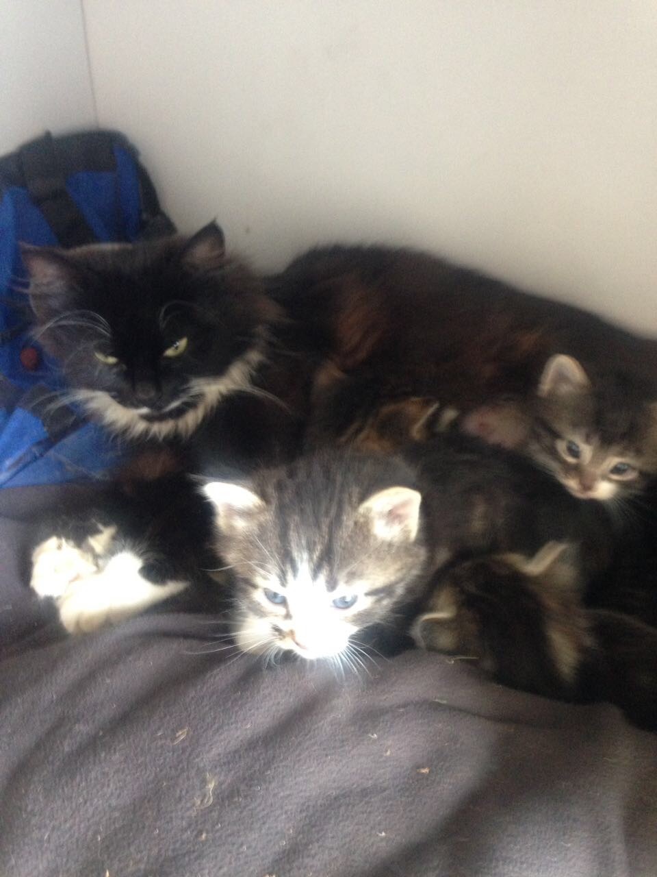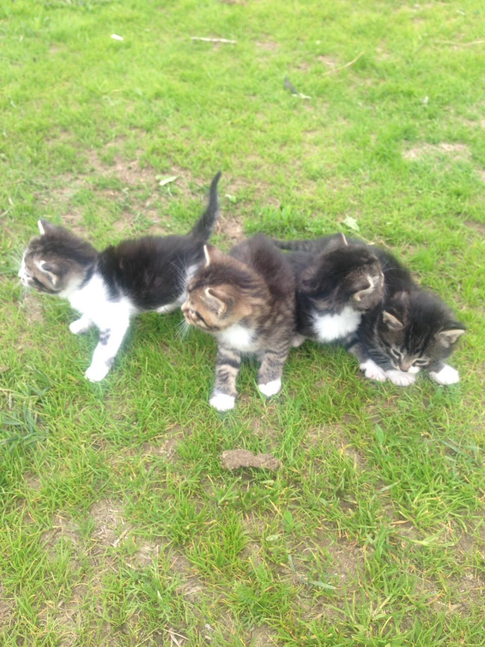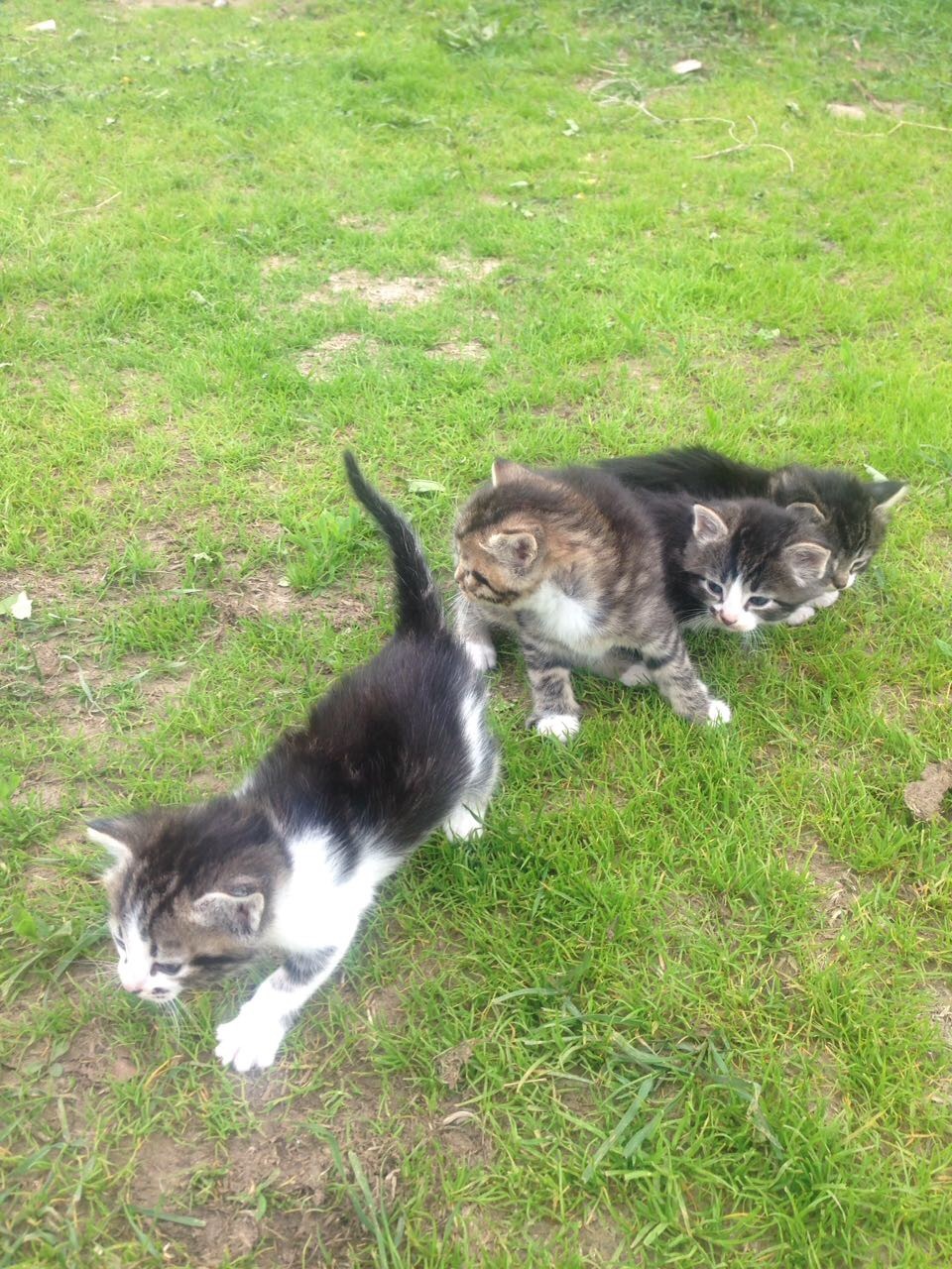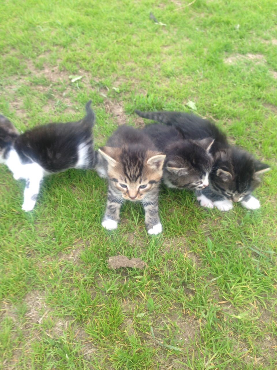 На участке соседа по даче, в Ленинградской области, уличная кошка родила недавно четверых котят. Сейчас им уже около 5 недель, все это время они жили на улице, в коробке, и уже прекрасно знают про дождь, снег с градом, и остальные "чудеса" ленинградского лета.