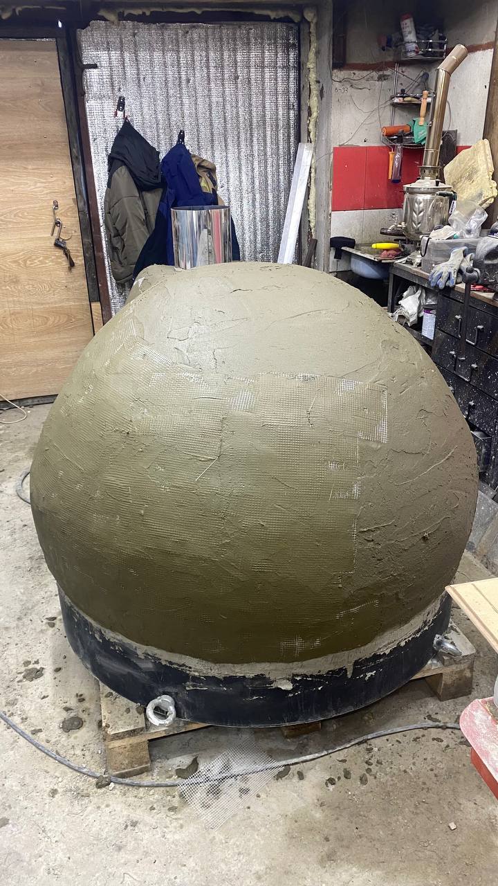 Как плита высохнет, через пару дней начинаю собирать под, устье печи, купол и в конце вставляю трубу)