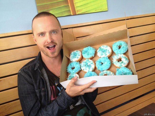 Чисто голубые делали. Был специальный голубой сахар, в который макали пончик. Дело в том что там один раз в сезон всегда появляется новый вкус. Плюс специальные виды пончиков для праздников (рождественские, хеллоуин, день святого валентина и тп)
