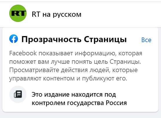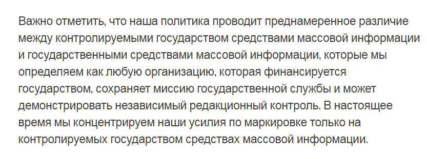 Причём пометки будут получать те страницы, которые по исключительному мнению фейсбука полностью или частично находятся под редакторским контролем своего правительства, как контролируемые государством СМИ.