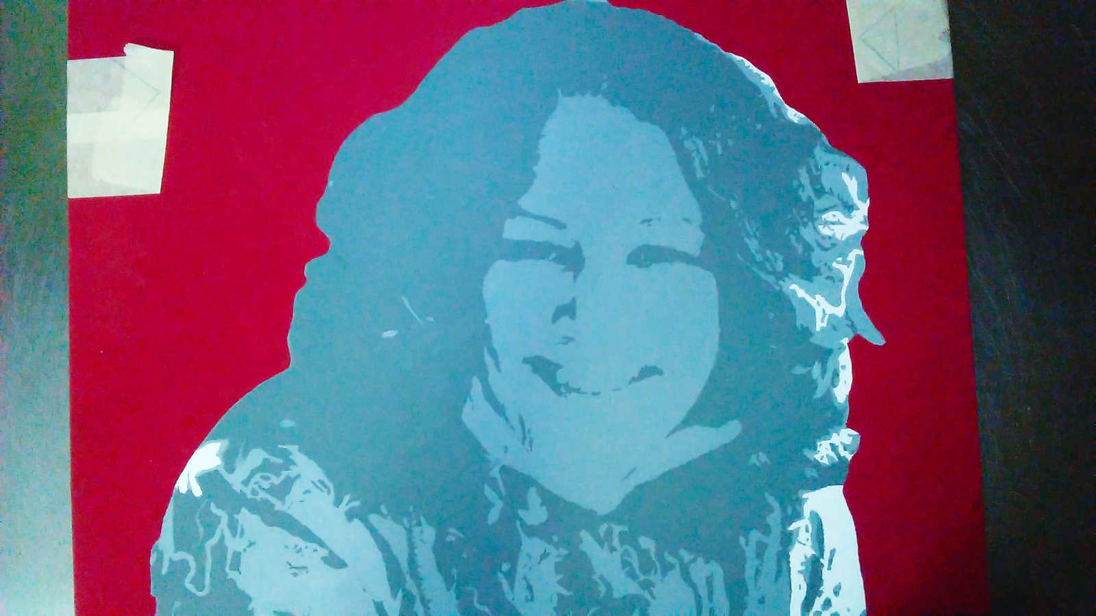 В ходе манипуляций с фото в итоге получился семислойный трафарет. Что это значит: каждый слой наносится определенным оттенком от светлого к темному цветам. В моем случае от белого к черному (4 трафарета с более крупными деталями) и от темно-серого к белому (3 трафарета с мелкими деталями). Мелкие детали это - черты лица, волосы и пр. Далее пишу нанесение слоев по порядку: