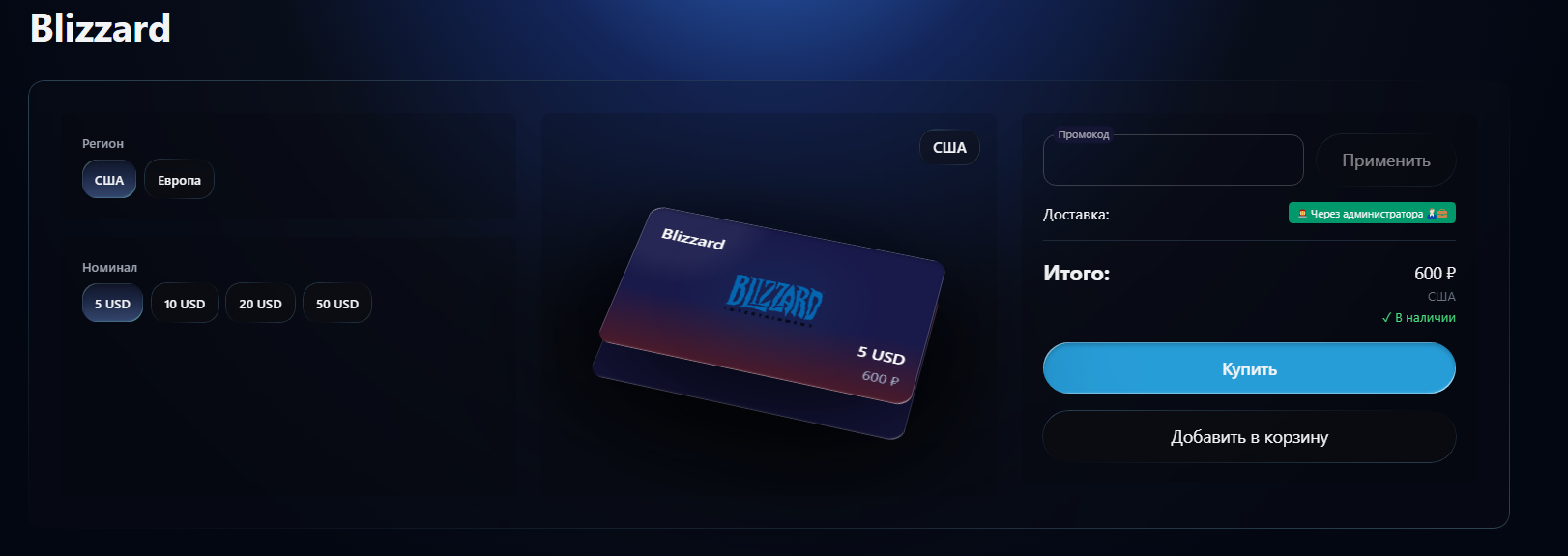 Выберите подходящий номинал для пополнения кошелька Battle net и оформите заказ.
