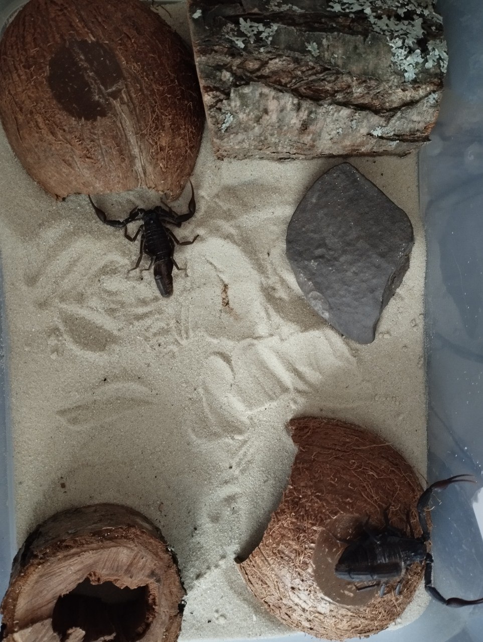 Грунт: Песчаный или песчано-глинистый субстрат слоем 5–10 см. Это позволит скорпиону рыть норы, что является естественным поведением для этого вида.