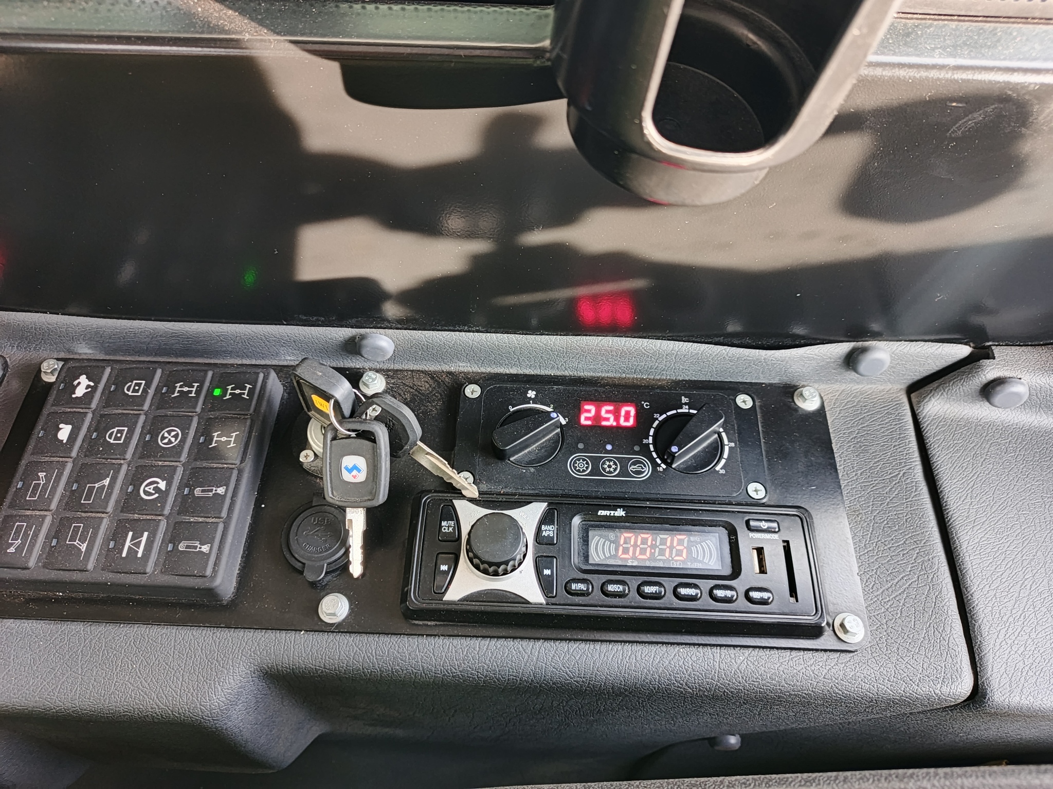 Салон- кресло/подлокотники, два монитора. Заявлено климат-контроль, магнитола. Ребята катались в поле, говорили, что кондиционер не работает. Но там есть вентилятор, всё продумано :D