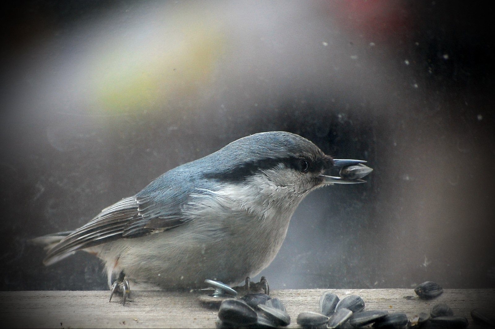 Поползень с семечкой подсолнуха в клюве на моём балконе.