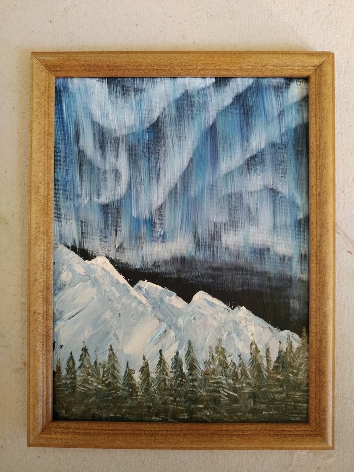 получилось похуже оригинала из видео (ну так я нигде и не учился), но теперь свои ошибки знаю и если придётся повторить, северное сияние будет явно более похожим. (Холст на картоне, масло, размер А4)