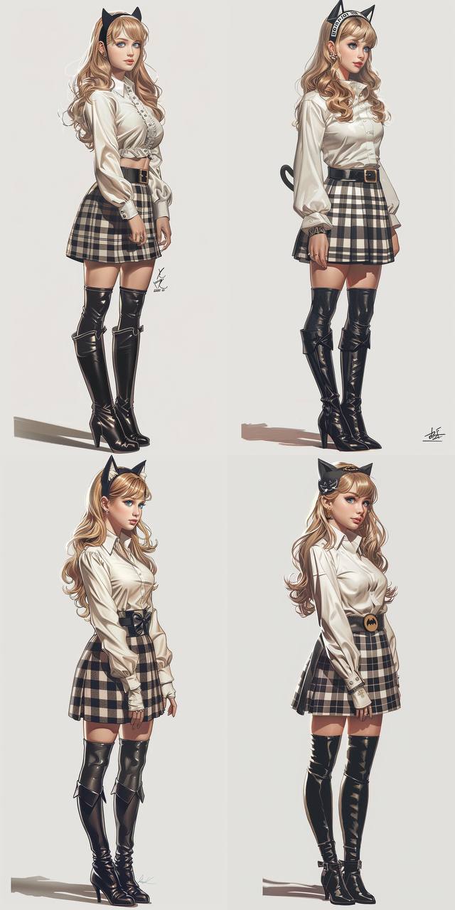 промт: full body shot, girl, looks to the right side, fair hair of medium length, headband with cat ears, blue eyes, white blouse, black and white plaid skirt, black thigh high boots, dc comic book style, white background --no look at the camera, no anime style --ar 1:2 --v 6.0