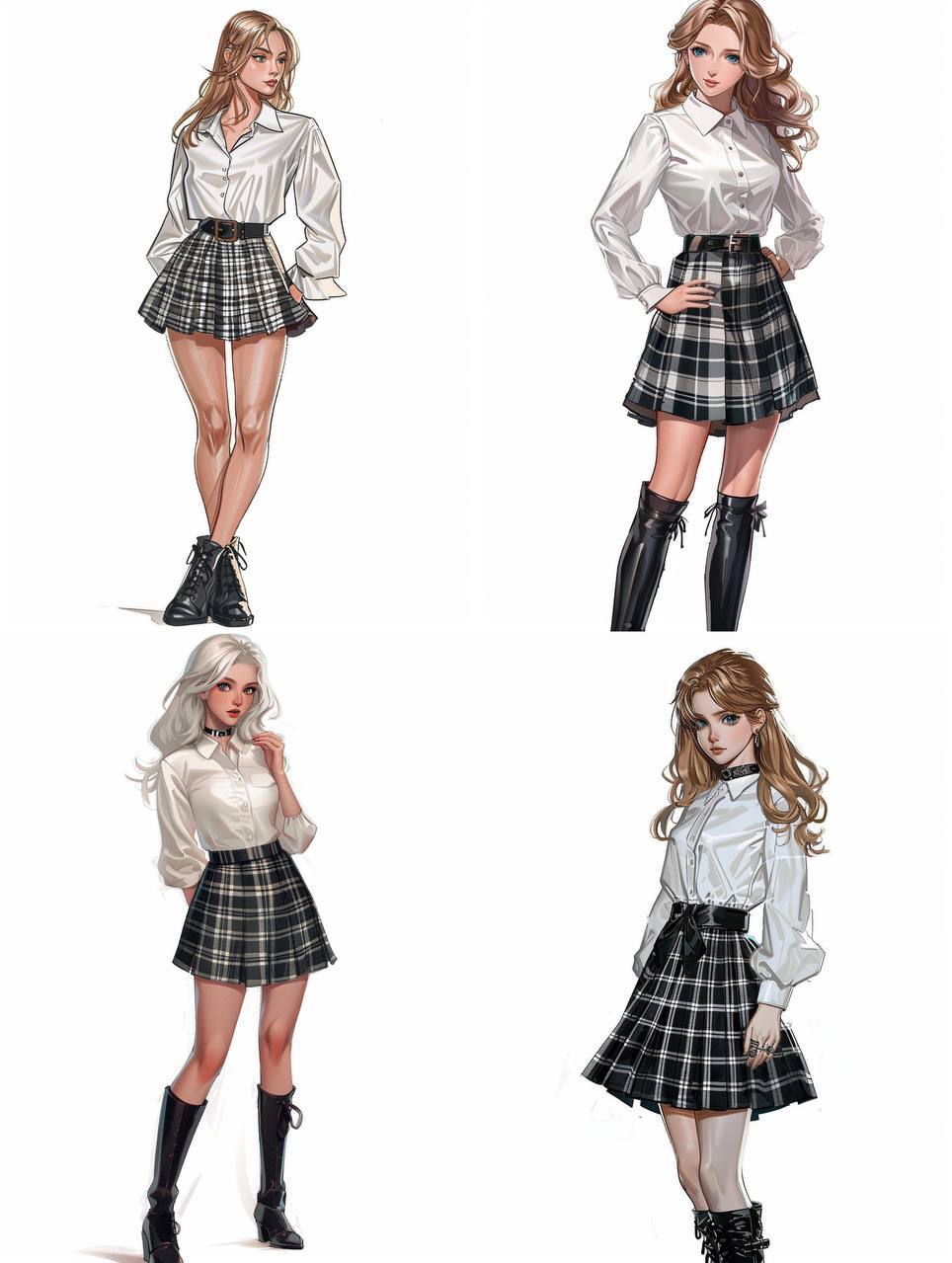 промт: full body shot, girl, height 156 centimeters, 3/4 head pose, looks to the side, fair hair of medium length, blue eyes, white blouse, black and white plaid skirt, black boots above the knee, comic book style, white background --ar 3:4 --v 6.0