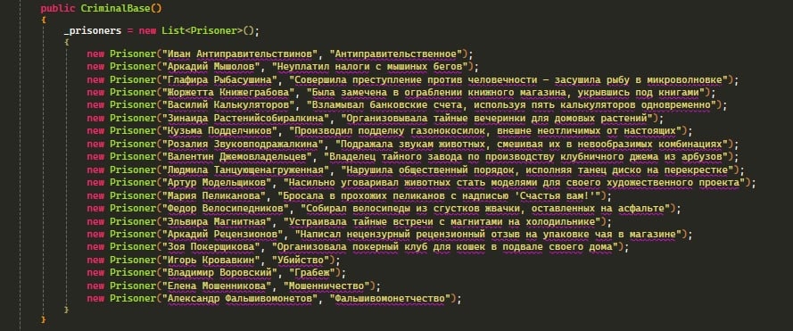 14 OuroborosTFB IT-юмор Попросил нейросеть придумать мне список преступников 2 года назад Поржал. Велосипеда из сгустков жвачки. [моё] IT Csharp Программирование 3 Ещё 0