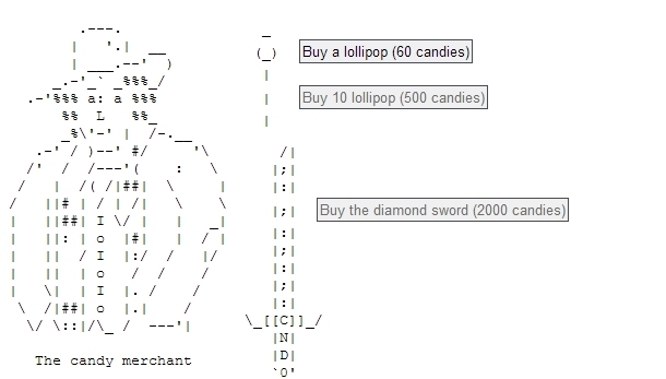 Никто не сказал мне, что на дворе 2017 год, поэтому игра, которую я делаю - это текстовый квест с честной ASCII-графикой. Называется он "Плезир: усопший прадед и разговорчивый кот" и выглядит вот так: