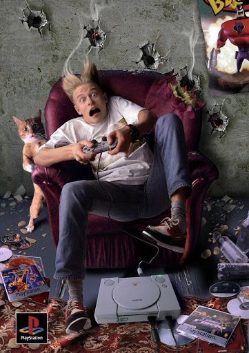 Всем привет. Очень много лет назад был у меня журнал, не помню название, так вот на обложке была реклама sony playstation 1. Что помню: чувак сидит с джойстиком в комнате и волосы дымятся типо как от пули или снаряда. А рядом был кот с офигевшей от этого мордой(Но это не точно). Суть в том что чувак очень похож на меня. Помогите найти картинку. Что то как то вспомнилось на ночь глядя)))