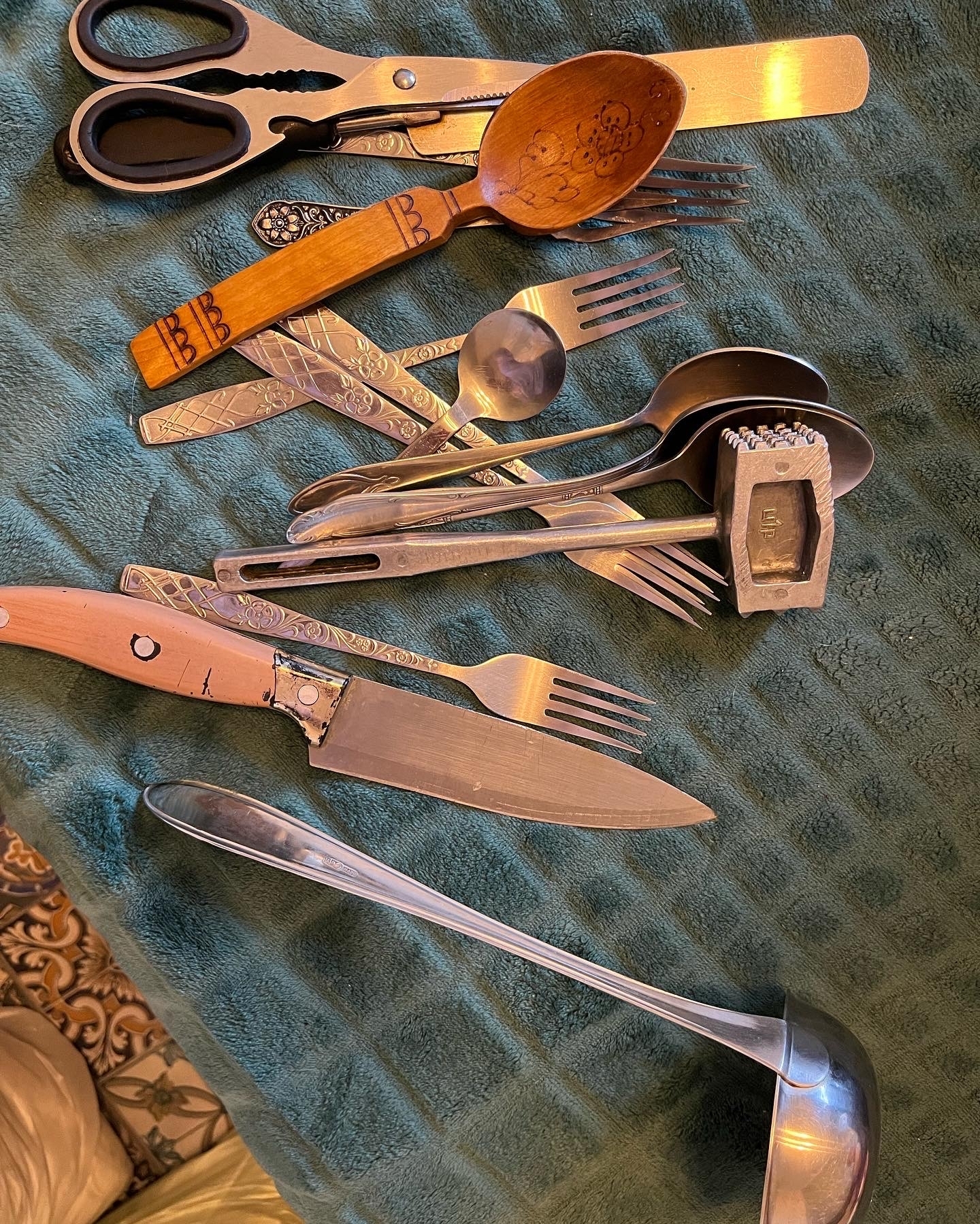 - Самое интересное: они украли мои ложки! Мои ЛОЖКИ! Столовые приборы фирмы zepter – столовые ложки/вилки/ножи/чайные ложки на 6 персон. Открывашка/венчик так же фирмы zepter, ориентировочная стоимость комплекта более 30 тысяч рублей (были заменены на дешевые вилки и ложки, ножи и прочую кухонную утварь). Замена предоставлена на фотографии. Посуда куплена 20 лет назад мамой и была мне подарена перед свадьбой. Данная посуда находилась в использовании более 10 лет! Да, посуда качественная и очень хорошая. Но ЛОЖКИ! Б/У ЛОЖКИ!!! Я ими больше 10 лет ела, блин!