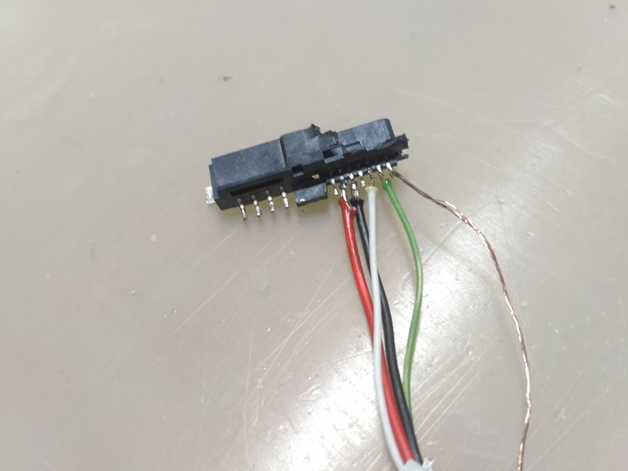 Перелопатив много инфы в тырнетах, выяснил, что провода не должны быть слишком длинными и толстыми, что бы не было наводок. Я достал старый айфоновский кабель и пустил его под нож и паяльник, а для верности еще и горячими соплями капнул.
