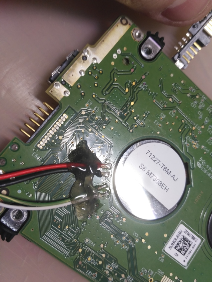 Теперь надо напаять на тестпоинты сата-кабель, ну или разъем саташный. Кабеля я зажал, а вот мертвых винтов у меня достаточно, поэтому тупо содрал разъем с первой попавшейся платы.
