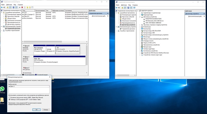 Это исчадие ада не хочет специализироваться, хотя в диспетчере устройств он отобразился, что не может не радовать. Но к сожалению ни Виктория, ни р-студио не хотят работать с винтом, который не прошел инициализацию.