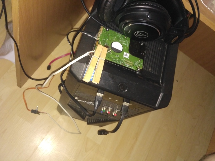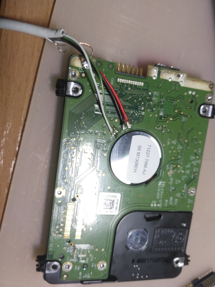 Но то только канал данных, винту нужно еще и питание, поэтому надо либо подпаять на плату провода и запиать их в молекс, либо воспользоваться микро-усб разъемом, в который питание пойдет с УСБ порта компа. Замечу, что только питание надо брать с УСБ, если ты будешь юзать микро-усб кабель от телефона, то у тебя система будет пытаться определить УСБ-контролер на плате винчестера. Что бы этого не произошло - надо обрезать D+ D- опять же на плате, либо пересобрав кабель, вырезав всю его семью проводки передачи данных(белый и зеленый). У меня же нашелся шнурок от повербанка, где провода данных напрочь отсутствуют. Подсоединил на выключенной машине всю эту порнографию