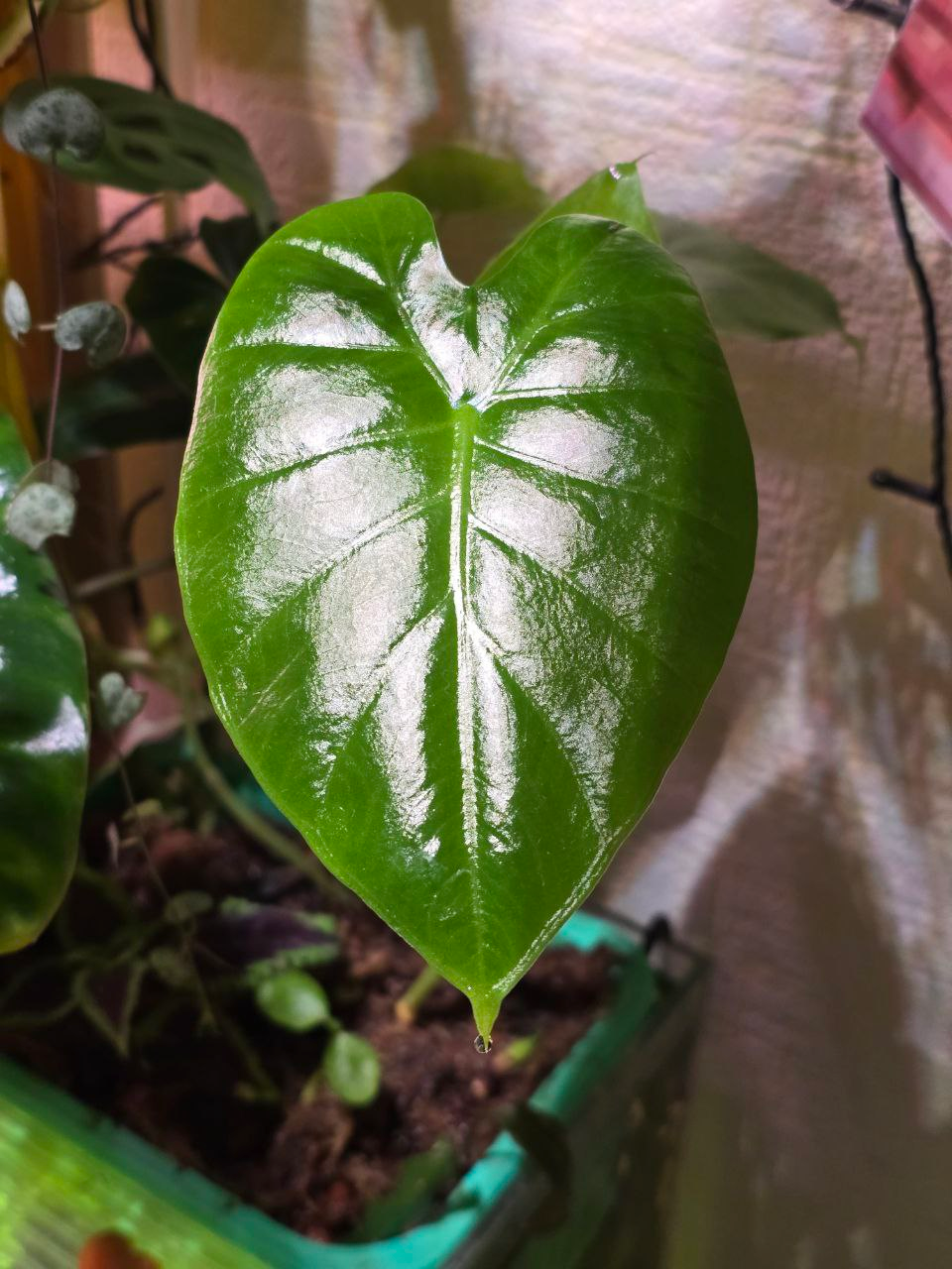 Остались излишки алоказии неизвестного мне сорта, решил высадить их в аквариумный лоток, посмотреть выживет или же нет. И на удивление ей понравилось, влага аж через лист сочится