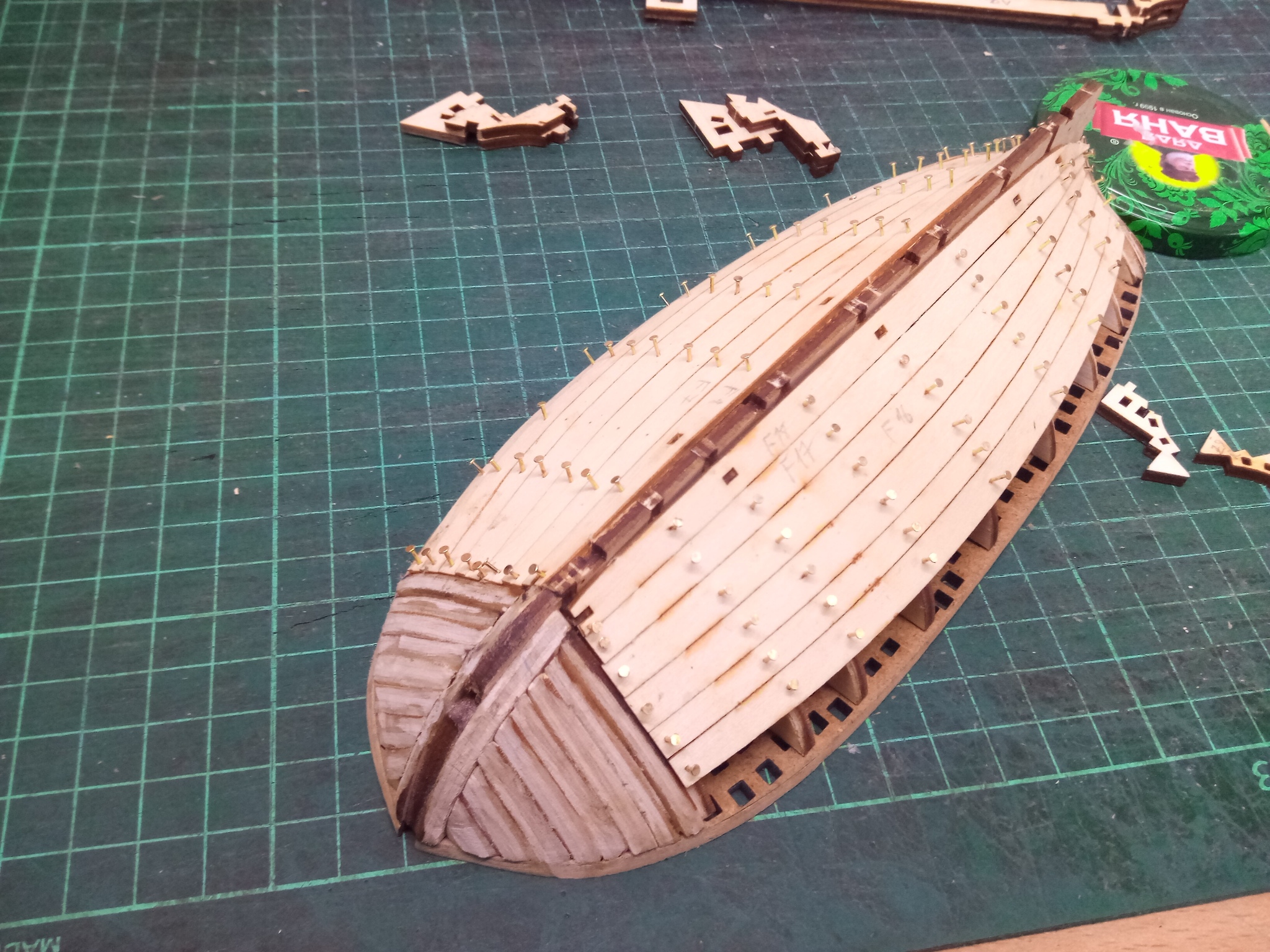 Устанавливаем все рейки черновой обшивки. По инструкции их необходимо прижимать гвоздями к шпангоутам на время высыхания клея. На рейках даже лазером отверстия под гвозди вырезаны. Вот только.... гвоздей в наборе не хватает, на три рейки (это 27 гвоздей) не хватило. Причем удивительно, копеешная деталь в таком богатом в целом наборе. Ну да ладно, сделал паузу в установке обшивки и начал собирать корму.