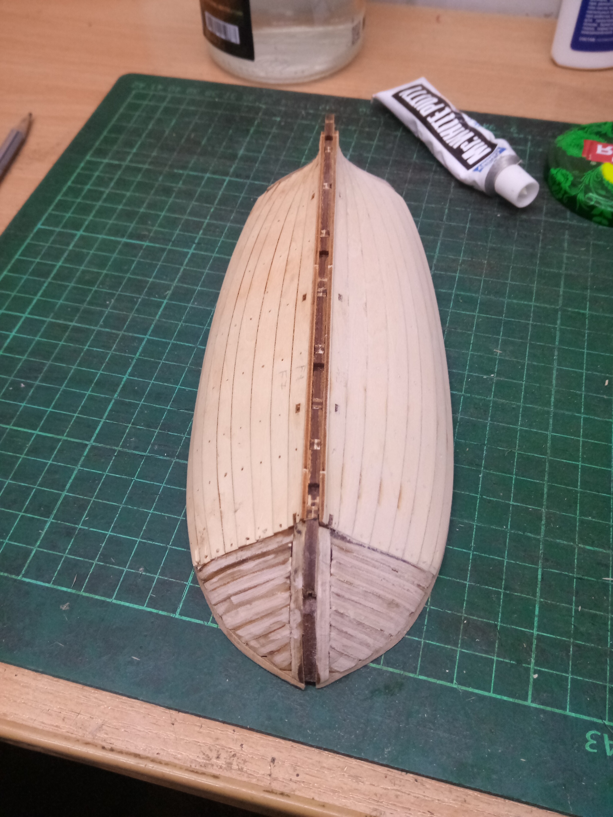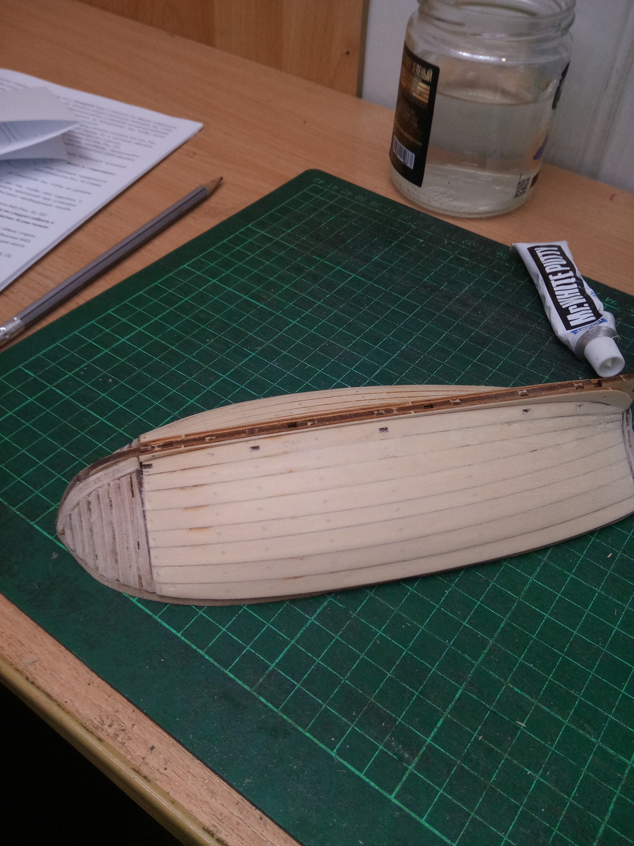 После кормы на следующий день, после высыхания корпуса доделал его и слегка прошелся наждачкой. По инструкции это делается позже, но принципиальной разницы не увидел. Заодно зашпаклевал щели и восстановил нос корабля. Нос собирается в первую очередь и ввиду отсутствия опыта сборки из дерева слишком много сточил на первой же детали. Впрочем, волшебная шпаклевка все исправляет, а сверху ляжет чистовая обшивка.
