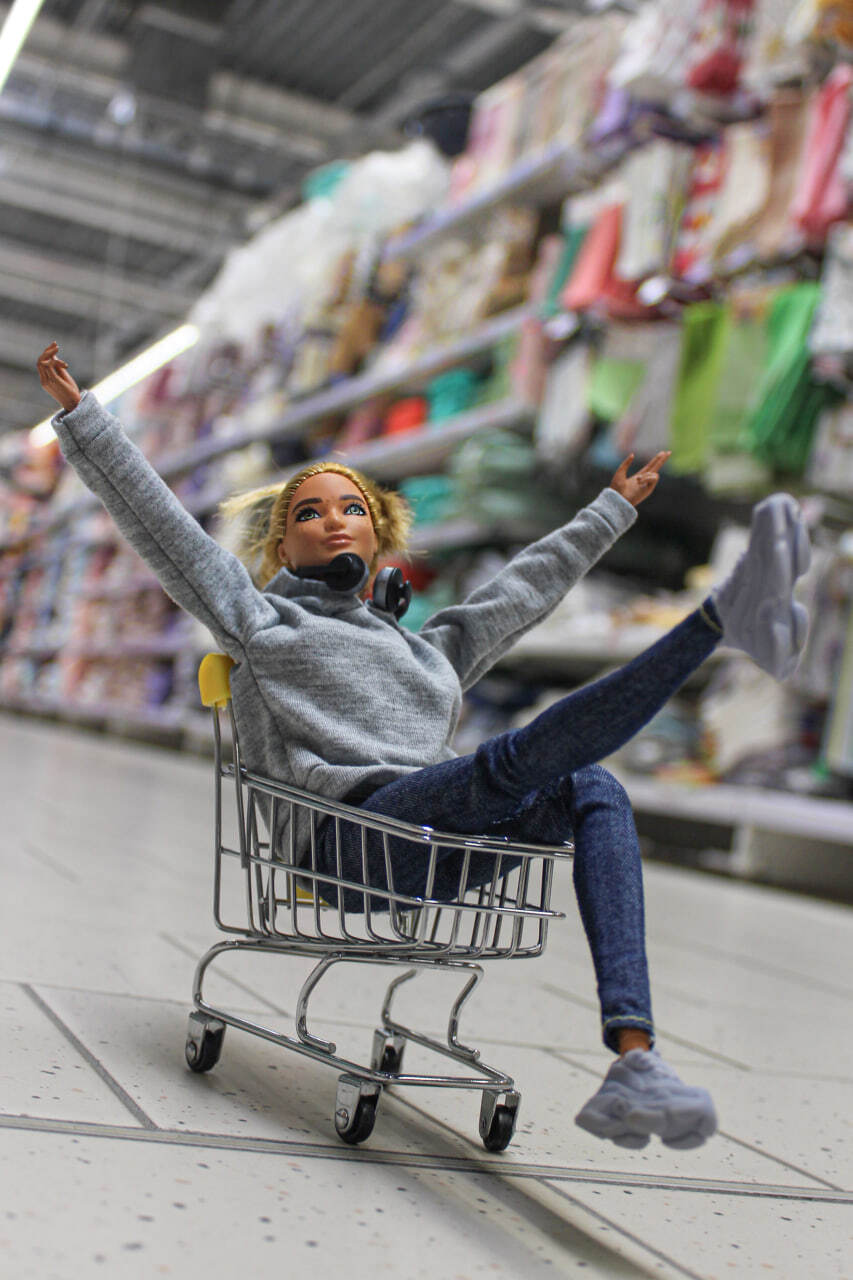 И мы снова на "натурных" съёмках. Да, это всего лишь одна фотка в магазине, но представьте, как взрослая женщина берёт с собой шарнирную барби, одевает её, обувает, запихивает в рюкзак вместе с мини-тележкой и фотоаппаратом, доезжает до Ашана, выстраивает композицию, ползает по полу, не обращая внимания на прохожих (потому что себе дороже, если будешь угадывать, что о тебе и твоём странном хобби думают окружающие).