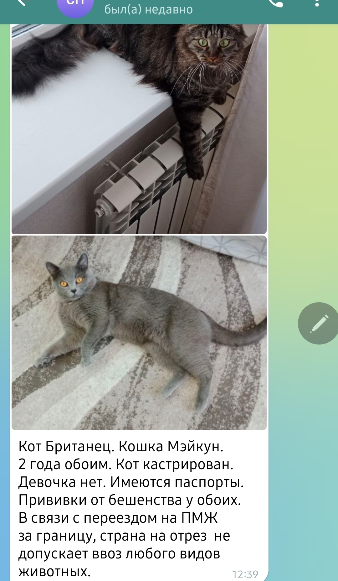 Мужчина сдал билеты на самолёт. Стал пристраивать кошек. Уговорил дочь забрать кошку, метиса мэйнкуна. Она в Москве живёт. Согласилась только кошку взять. Кошку он отправил в этот же день самолётом.