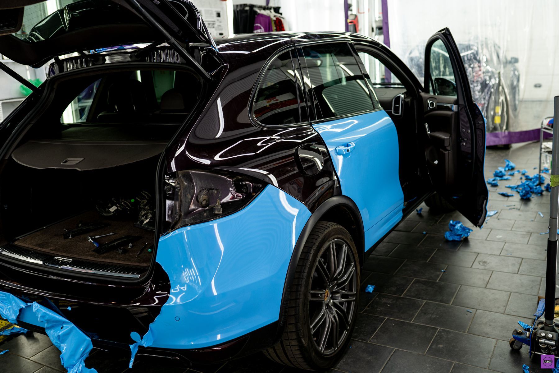 Есть у Porsche Cayenne одна особенность — он как хороший костюм: можно надеть в офис, можно на вечеринку, а можно и в грязь по колено, и всё равно будет выглядеть так, будто приехал с обложки журнала. Но наш экземпляр приехал ко мне в… голубой виниловой плёнке. Да, цвет «голубая мечта» на фоне имени «Cayenne» выглядел примерно как носки с сандалиями на деловой встрече.