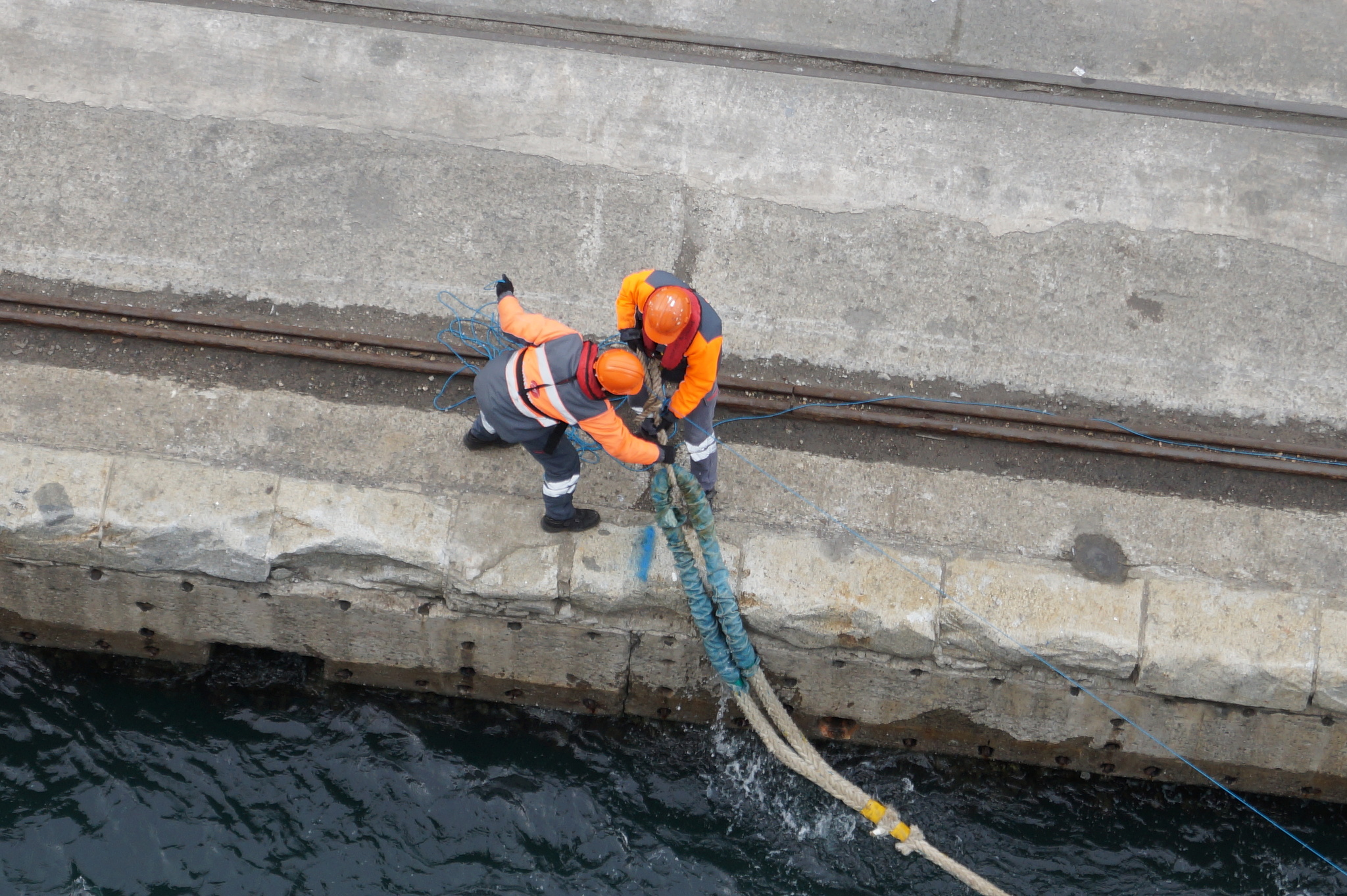 Швартовая команда тащит круизник к причалу, никакой механизации. Им сначала с борта пуляют тонкой верёвкой, они её тащат тащат, тащат тащат, потом вытаскивают толстенный этот канат и привязывают его специальным узлом к бетонной причальной стене.