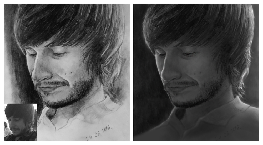 Не, фотография слева мало влияет на впечатление от рисунка ) Отвечая на Ваш комментарий выше: при контровом свете общий тон лица усреднён и сглажен и резко контрастирует с освещенным краем формы. У Вас блик на щеке и носу близок к тону лица, как будто со стороны зрителя есть ещё один источник освещения, но он больше никак себя не проявляет, это и путает. Красиво подсвеченные пряди волос справа от головы теряются на блёклом фоне. Его, имхо, стоит сделать если даже не очень тёмным, то однозначно более однородным, мягко растушевать, а мелкие волосы проработать остро срезанным краем стёрки (сама так делаю, удобно :3)