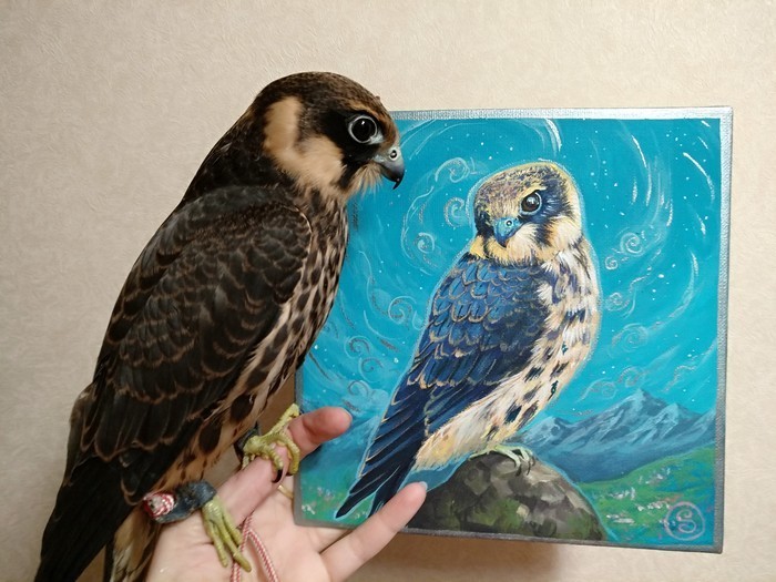 Портрет рисовался с фото на улице, в окружающих предметах всегда отражается окружение. Как правильно объяснили все отражается во всем, в большей или меньшей степени. Тем более учитывая что птица была перенесена под голубое небо в горах ,а оперение достаточно гладкое и блестящее , рефлекс от неба будет голубой