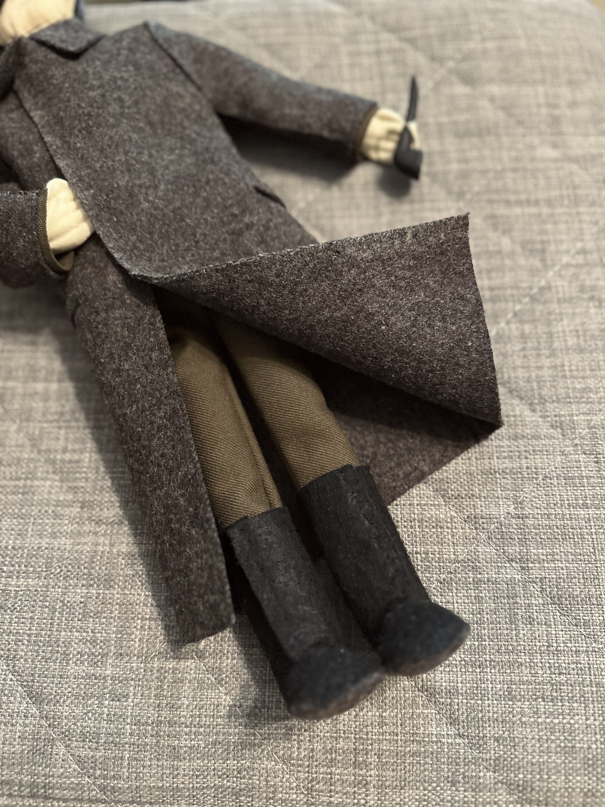 Обувь сделана из фетра, а подошва из драпа, как и пальто.