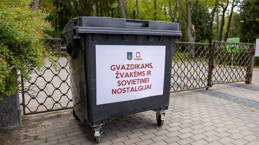 В столице соседней Литвы, Вильнюсе, на месте возложения цветов в память о советских солдатах литовские власти установили мусорный бак с изображением герба Украины и надписью: «Для гвоздик, свечей и советской ностальгии».