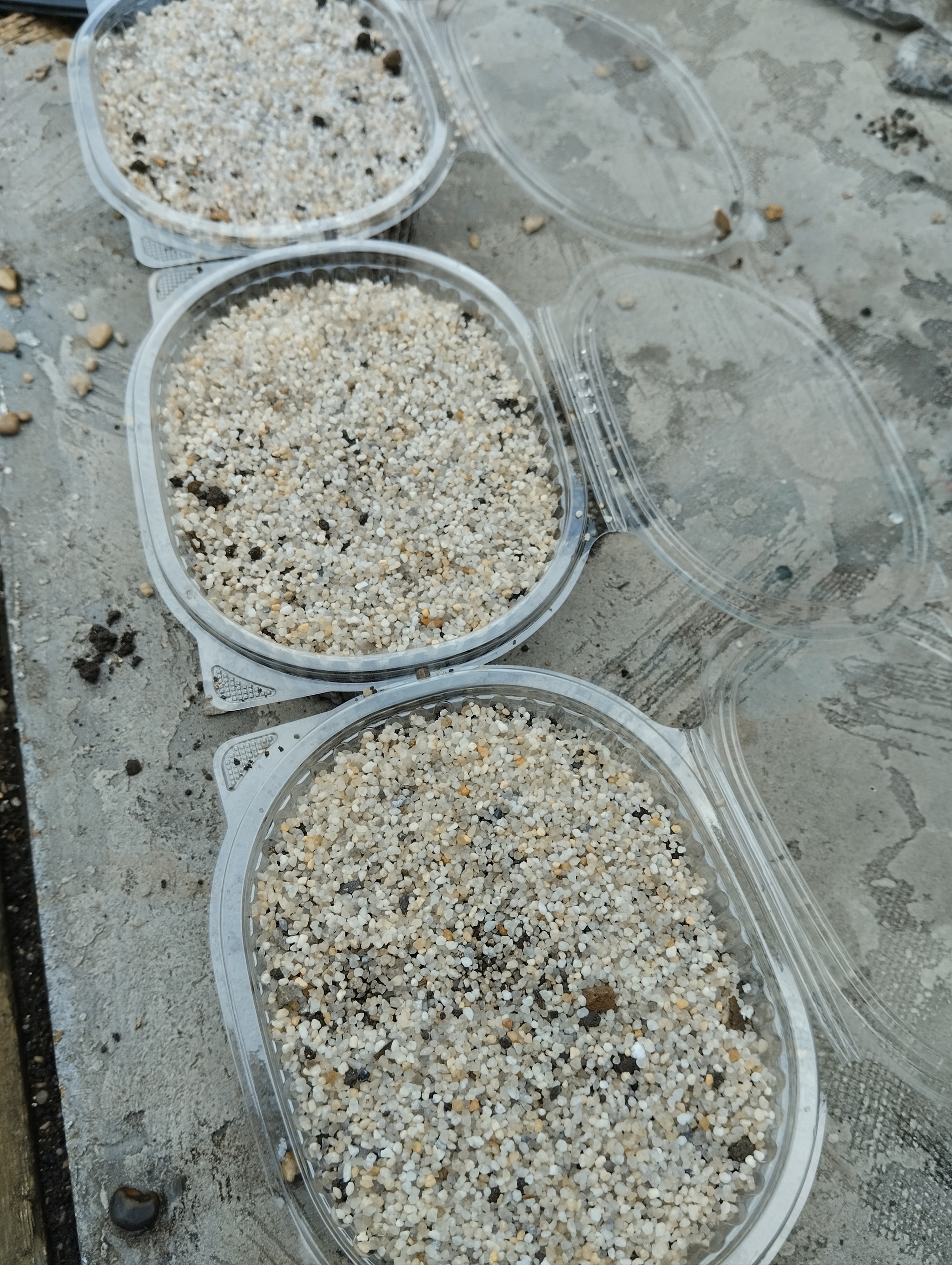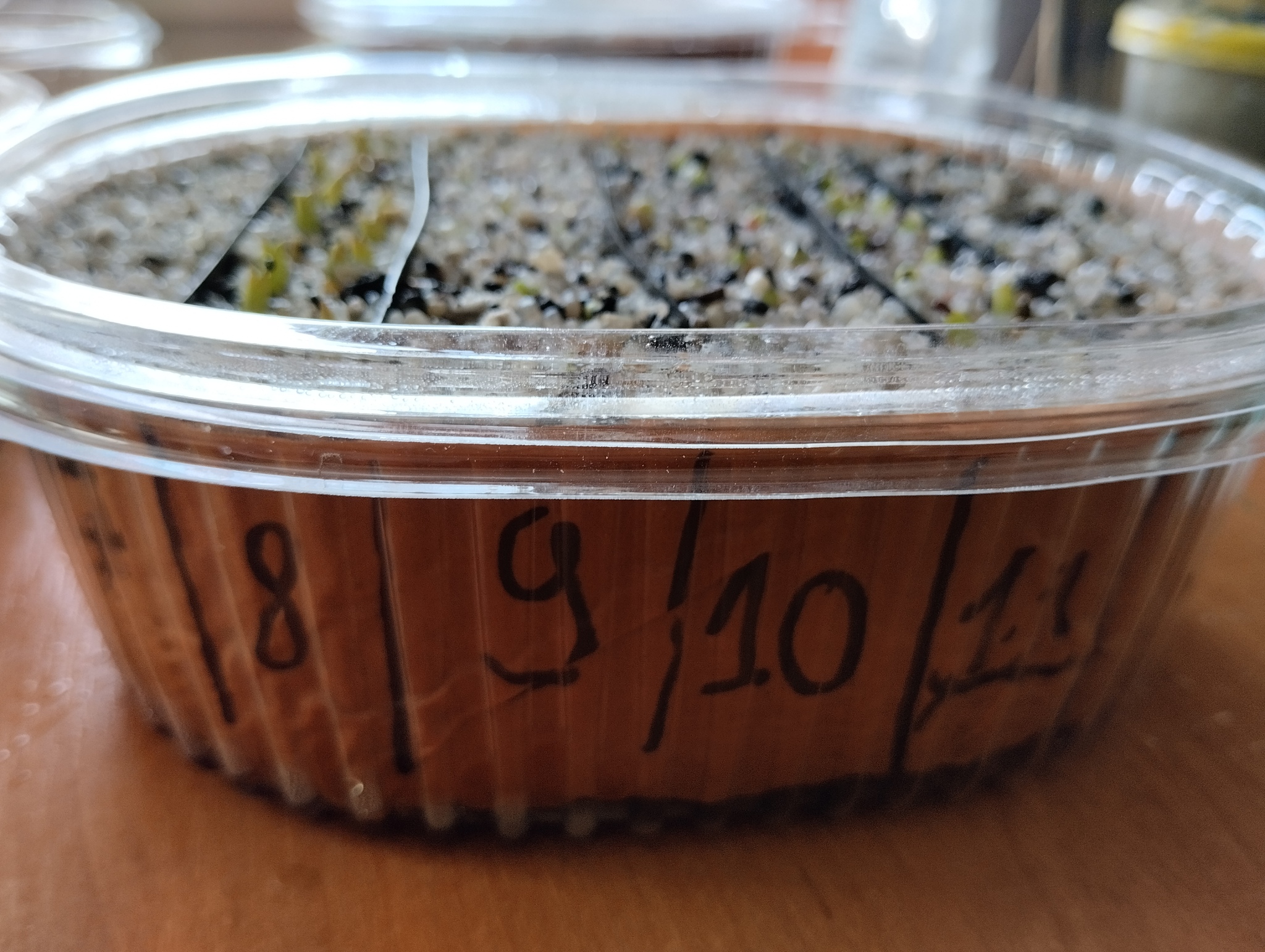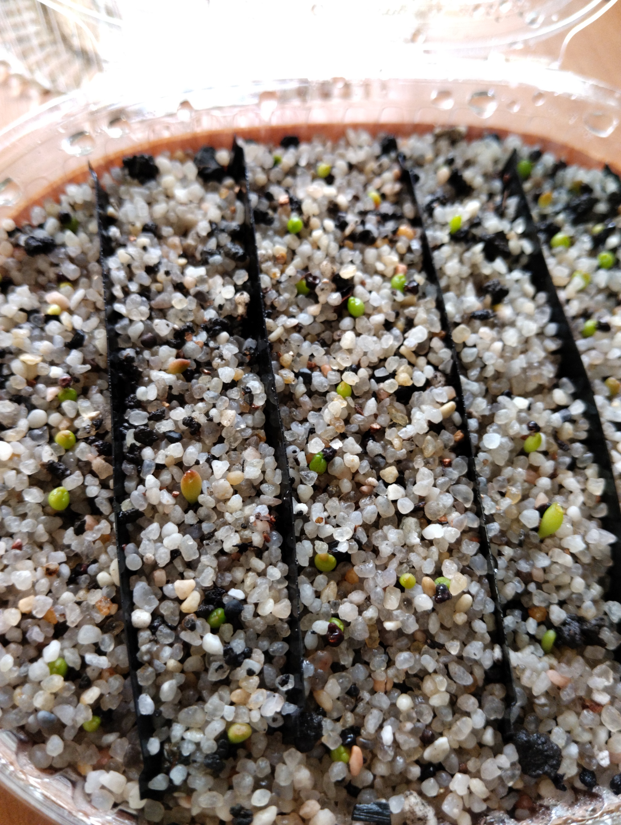 Сверху присыпал кварцевым песком, чтобы земля сильно не размывалась и семена были лучше видны. Не скажу, что это был умный ход. Фракция песка оказалась довольно крупной по сравнению с некоторыми семенами. Да и уровень готового грунта получился высоковат, слишком близко к крышке.