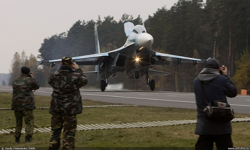 " Посадка здесь боевых самолетов под силу только первоклассным летчикам: шоссе в два раза уже стандартной взлетно-посадочной полосы, а сажать пришлось без помощи аэродромных радиотехнических средств. Но летчики, среди которых был и командир 61-й авиабазы полковник Юрий Воробьев, справились с этим блестяще. Прямо на шоссе президент Беларуси Александр Лукашенко наградил всех пилотов золотыми часами. Кстати, летчики 61-й авиабазы известны на весь мир: ими установлены 15 мировых рекордов на серийных боевых самолетах по высоте, скорости и полету на дальность на одной заправке." http://www.rg.ru/2008/10/30/uchenia.html