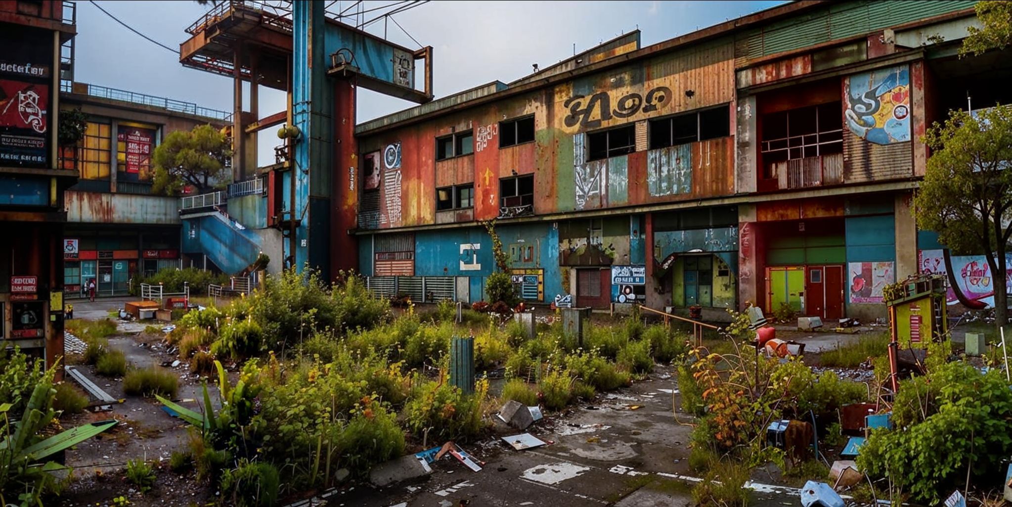 Prompt: The picture shows an old abandoned industrial area, covered with colorful graffiti and littered with garbage. Rusty iron and steel structures are scattered among overgrown vegetation and rotting wood. The urban setting is devoid of people, which creates an atmosphere of retro and vintage. There is a sense of abandonment and decay from this place, and industrial relics are now considered useless and falling into disrepair. Despite the dullness, there is a certain artistic quality in graffiti that gives the building a touch of creativity.