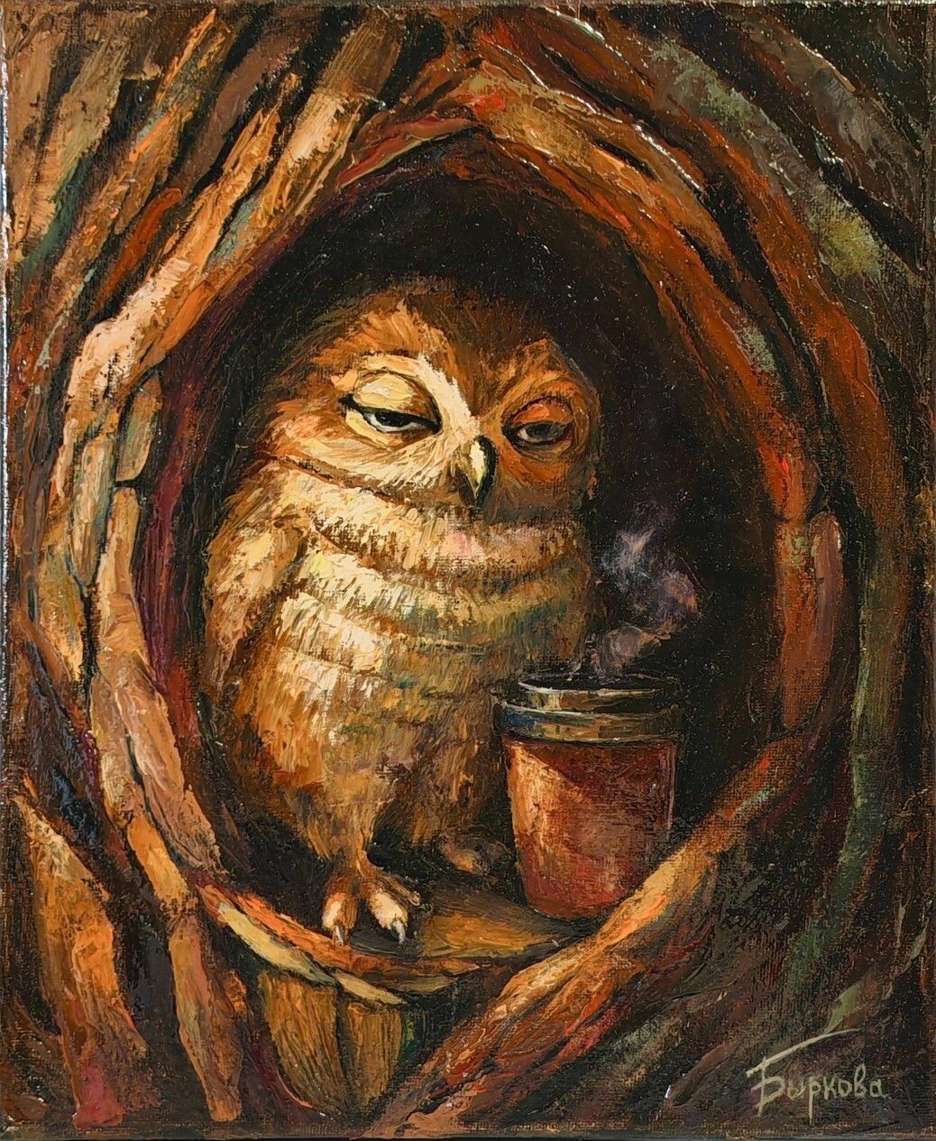 Картина "Сонная сова", холст на подрамнике, масло, 25*30 см., несколько литров чая и кофе