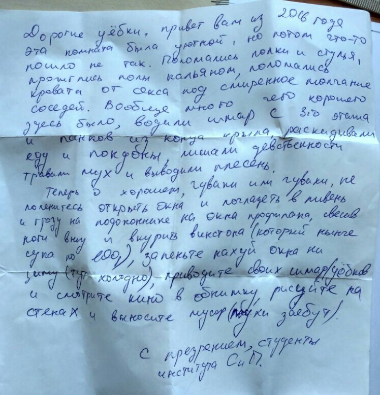 20 Fullloneliness Студенческое общество Послание из 2016 7 лет назад В начале сентября заселили в общагу от универа. Вчера решил впервые убраться в комнате и нашел это: [моё] Общежитие Послание