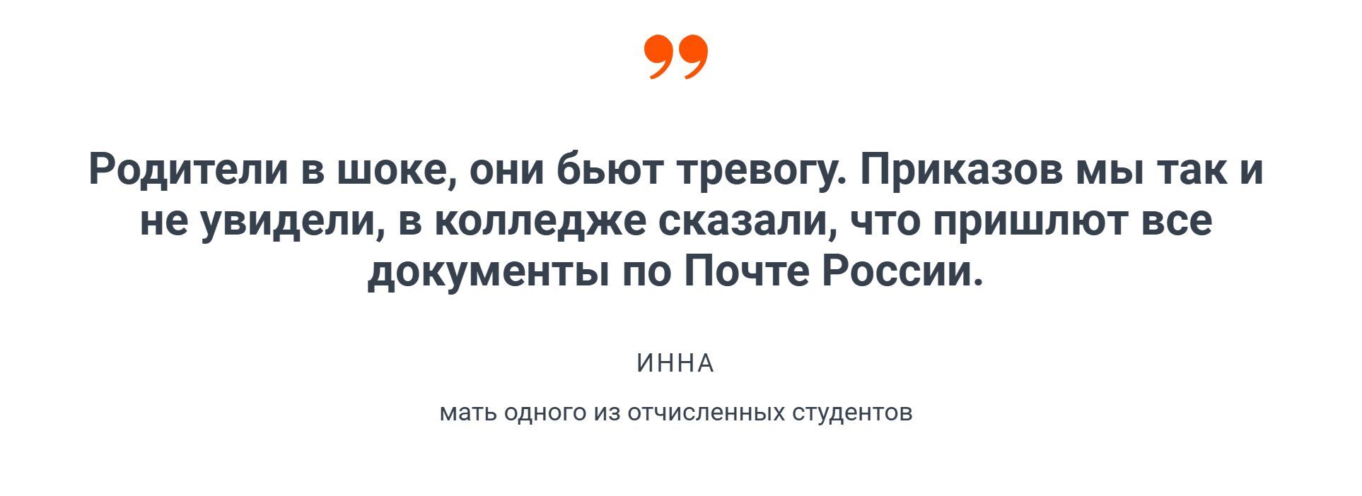 — 31 октября они собрали 15 детей, которые были на фото, и всем подсунули приказ об отчислении. Когда дети пытались звонить родителям, они выхватывали телефоны, запретили фотографировать приказ, — поделилась мать студента Инна (имя изменено).