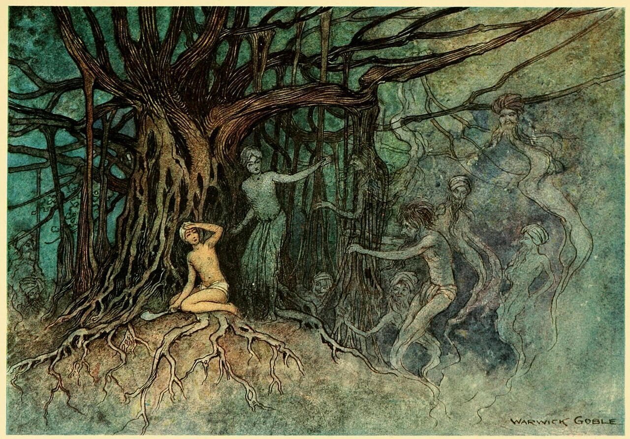 Доброжелательный призрак защищает бедняка от бхутов. Иллюстрация Уорвика Гобла к книге «Сказки Бенгалии»