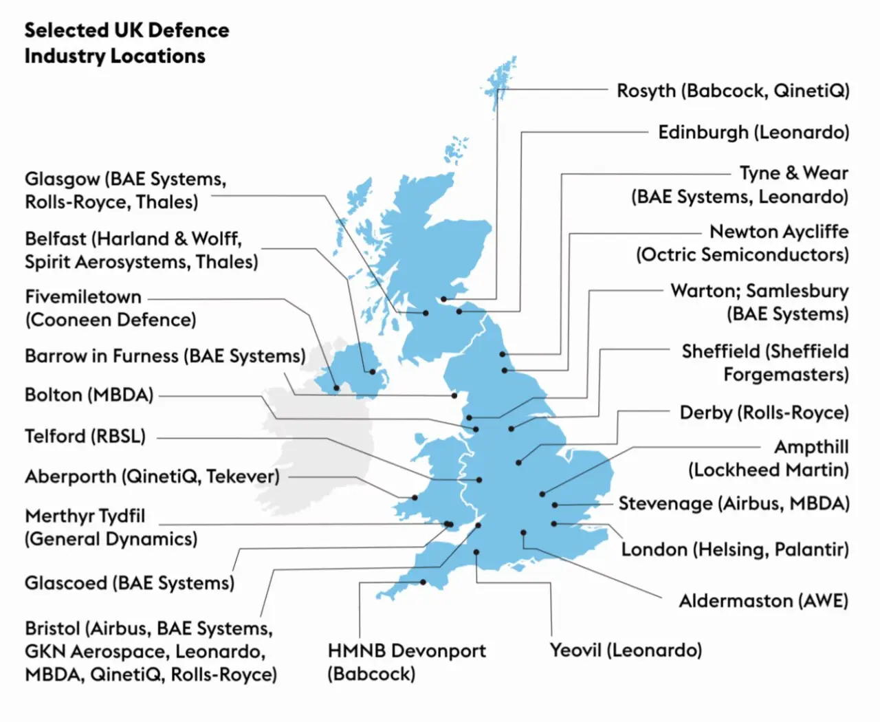 Бывший глава «Роскосмоса» и сенатор от Запорожской области Дмитрий Рогозин после череды громких заявлений отставных и действующих представителей руководства Великобритании опубликовал в своем Telegram-канале карту, на которой отмечены ключевые предприятия ВПК и объекты ядерной инфраструктуры островного королевства. На карте также показаны кластеры передовых отраслей с высоким потенциалом роста и даже общее количество рабочих мест, поддерживаемых британским министерством обороны.