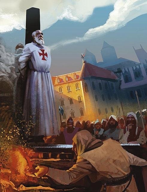 В последний момент, когда пламя уже охватило тело, Великий магистр указал в сторону дворца и крикнул: