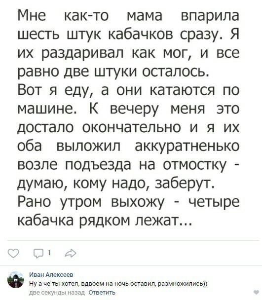 На завтро рано утром выхожу - четыре кабачка рядком лежат..