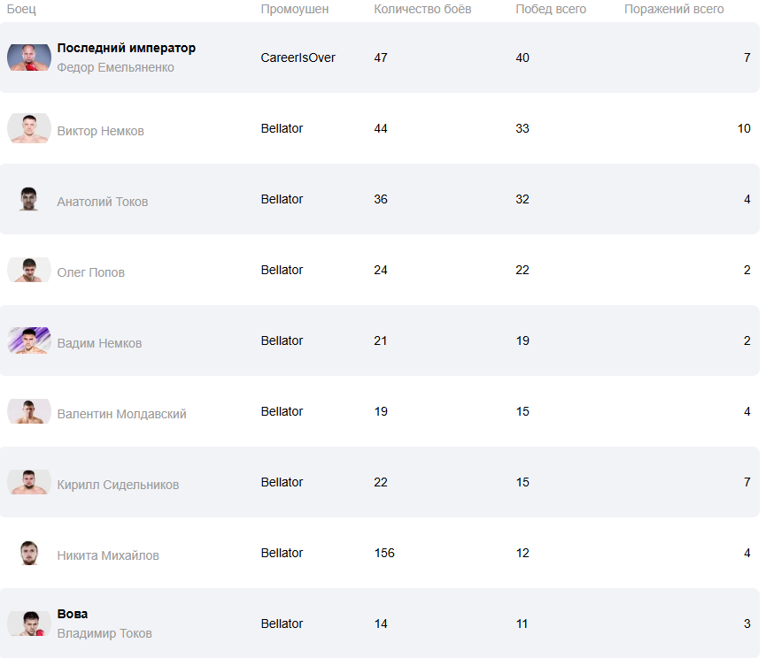 Сегодня, согласно сайту Meta-MMA, в команде Емельяненко состоят восемь бойцов, а их статистика говорит сама за себя:
