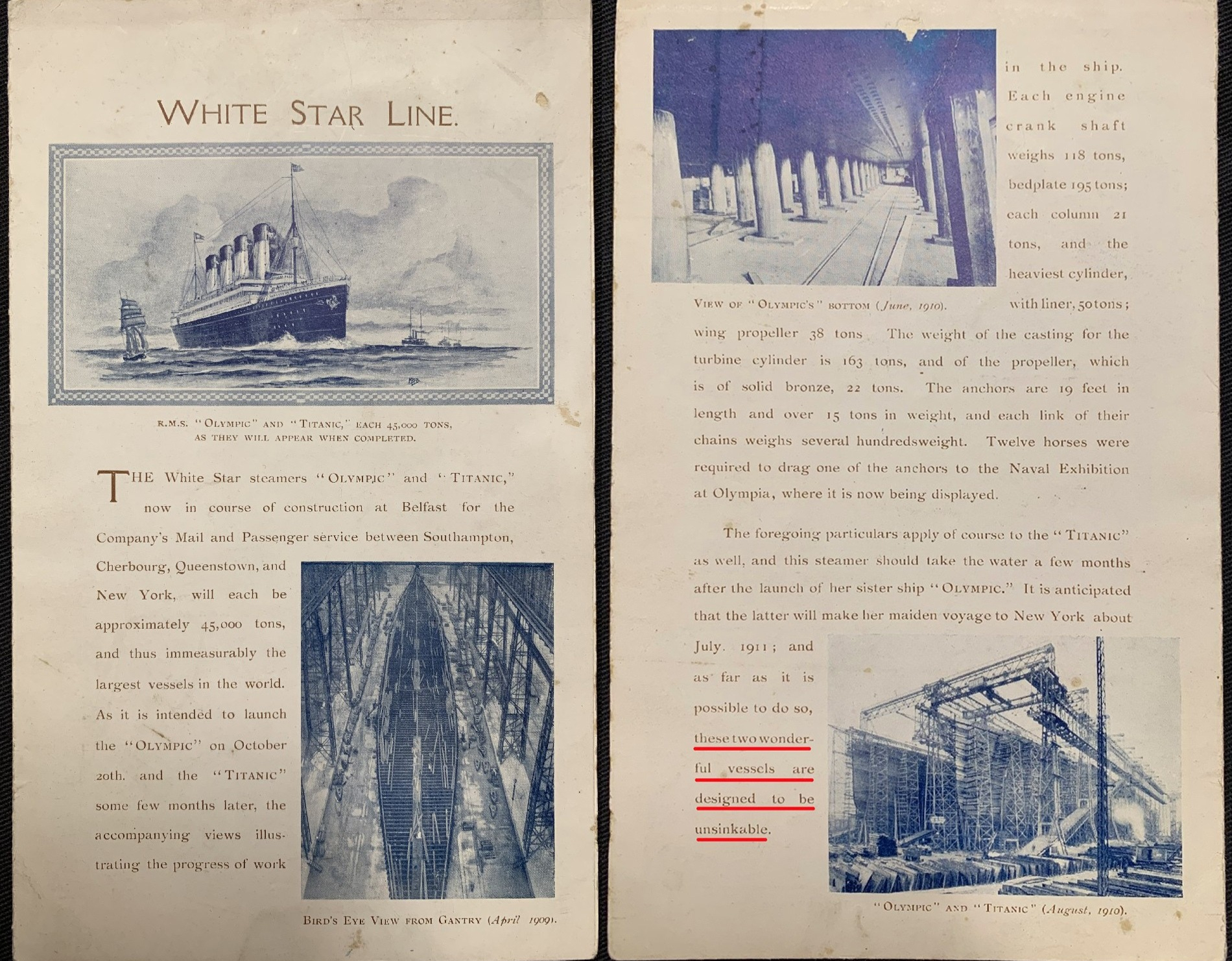 В брошюре, в которой рекламировали Олимпик и Титаник были слова о "непотопляемости" этих двух лайнеров. Брошюра была изготовлена самой Уайт Старлайн. Последний абзац: "И, насколько это может быть возможным, эти два замечательных судна спроектированы так, чтобы быть непотопляемыми"